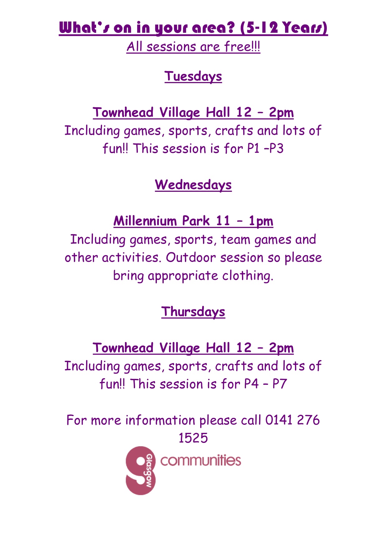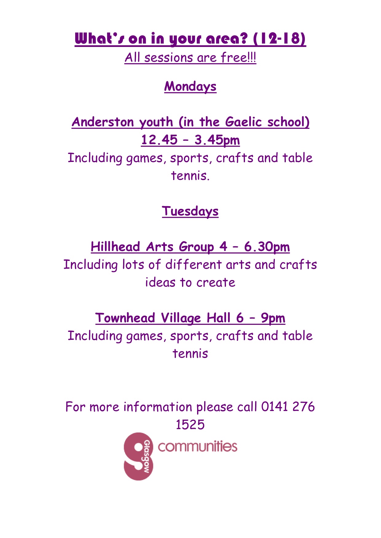 Glasgow Communities Events this summer. Leave a reply Lots on in Glasgow Parks and venues this summer. Here’s some stuff that mights be on near your. Enjoy! Share this: Click to share on X (Opens in new window) X Click to share on Facebook (Opens in new window) Facebook Like Loading... Related
